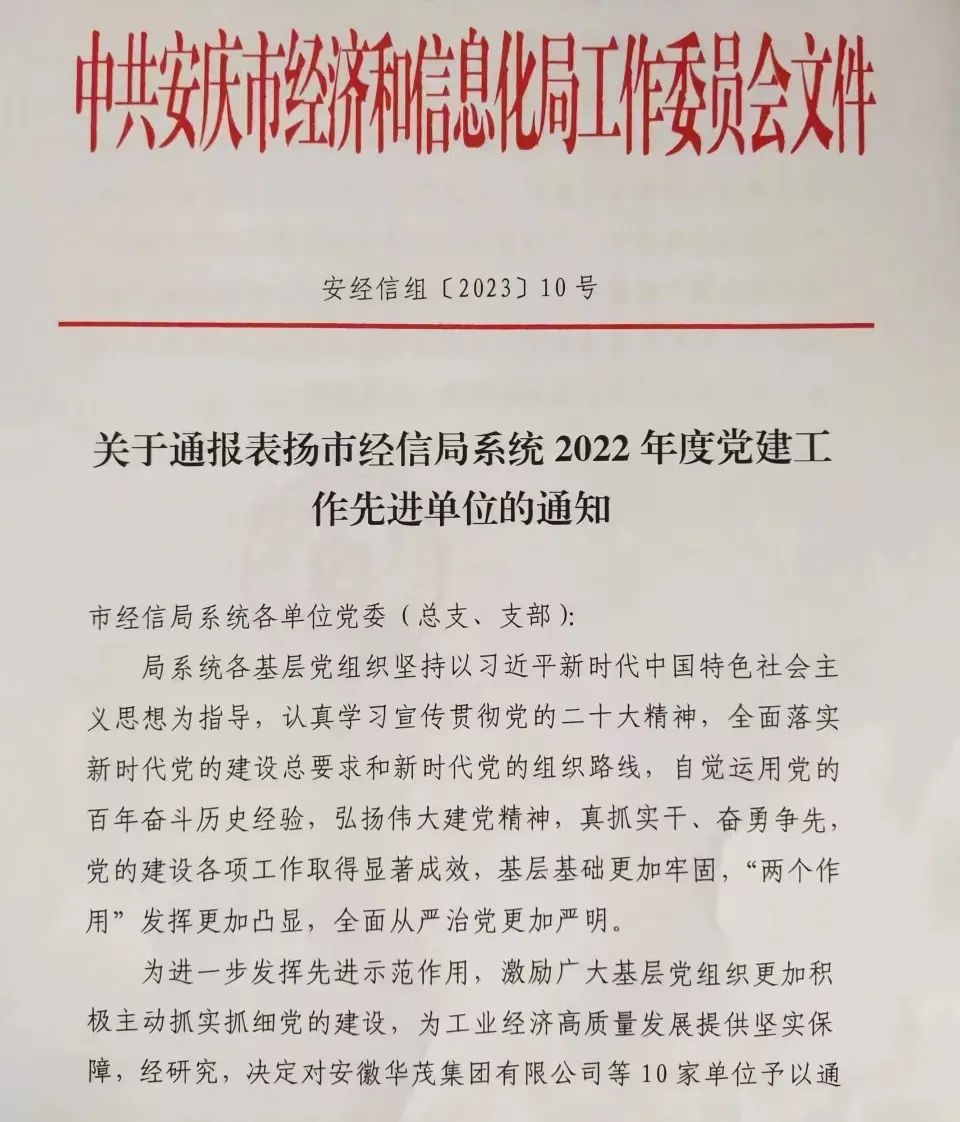 安徽向科党委荣获安庆市经信局系统2022年度党建工作先进单位荣誉称号